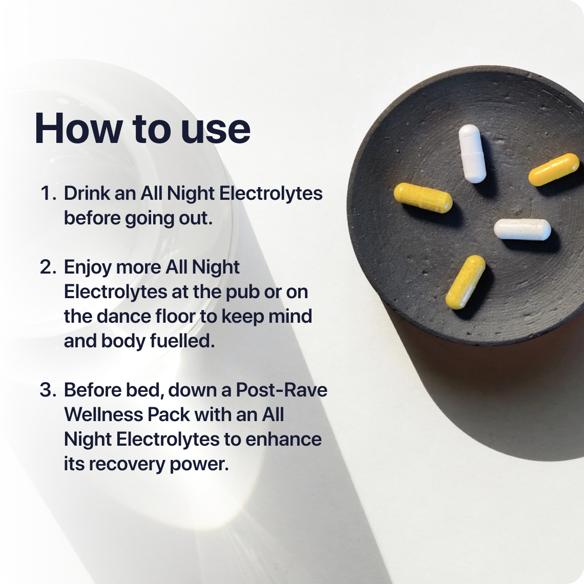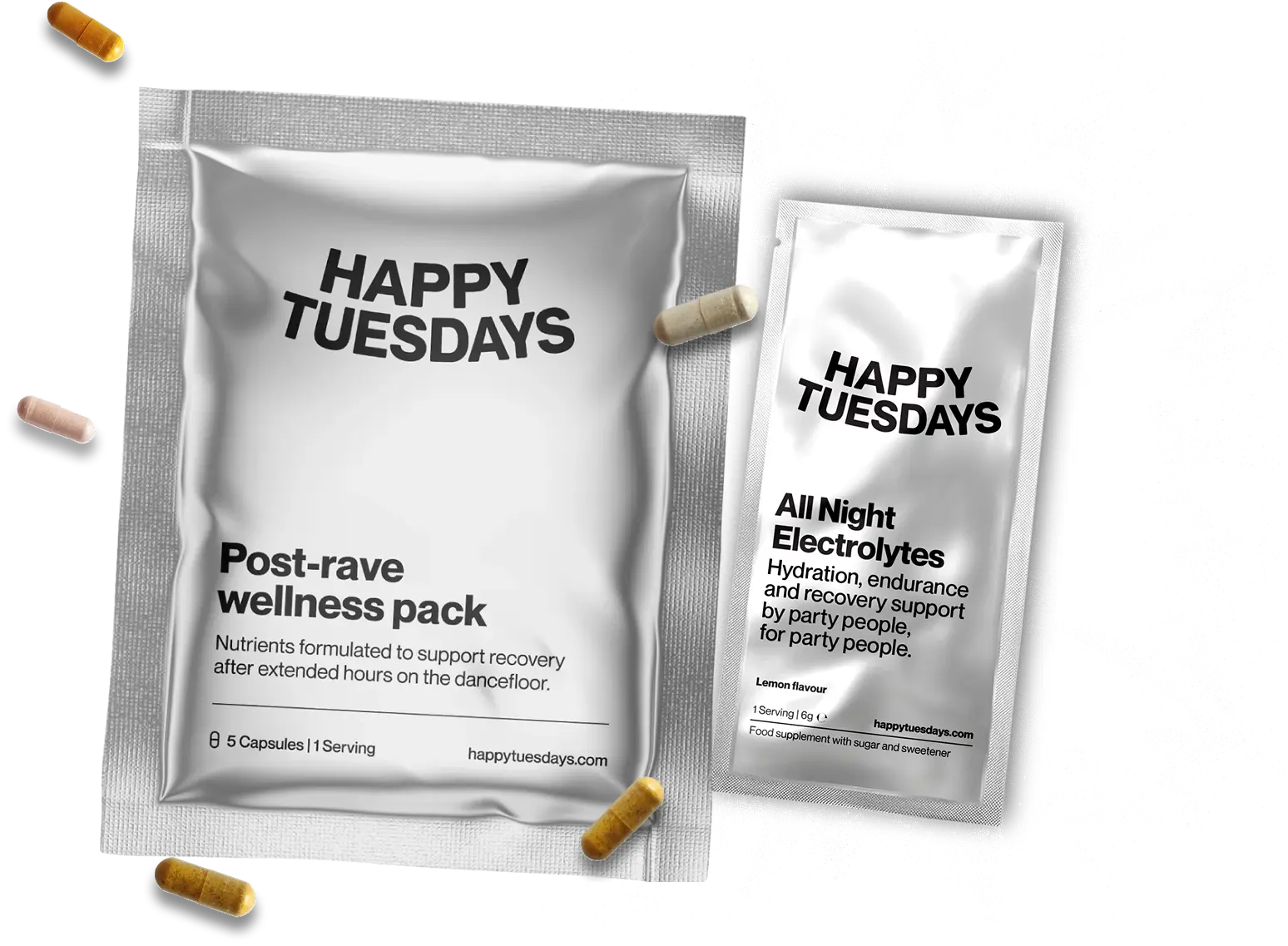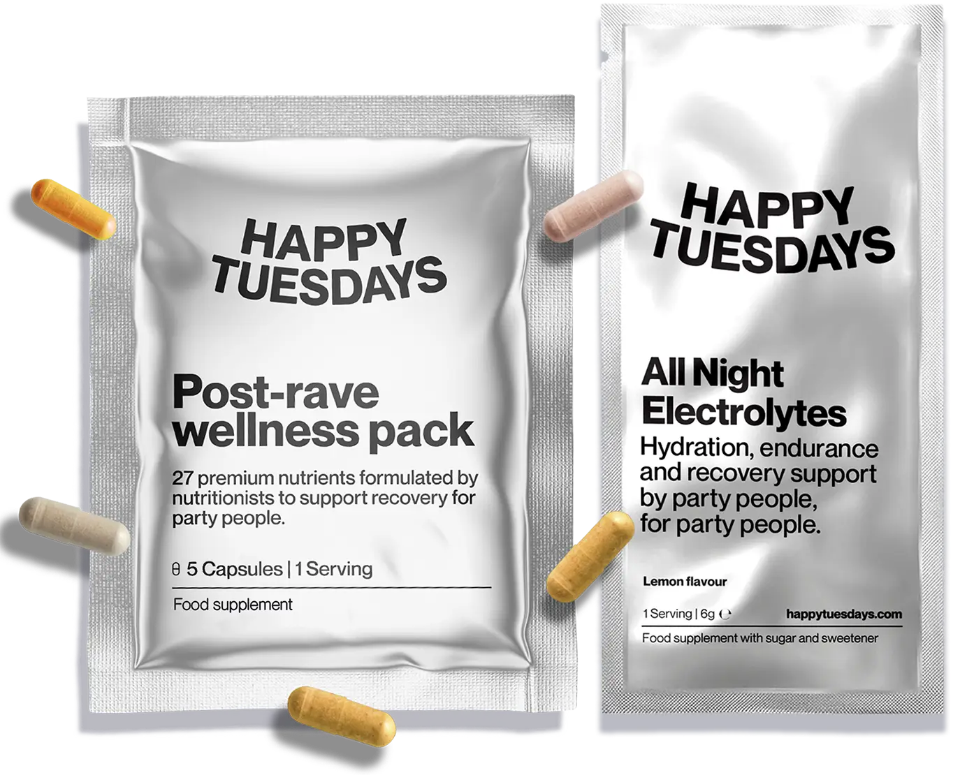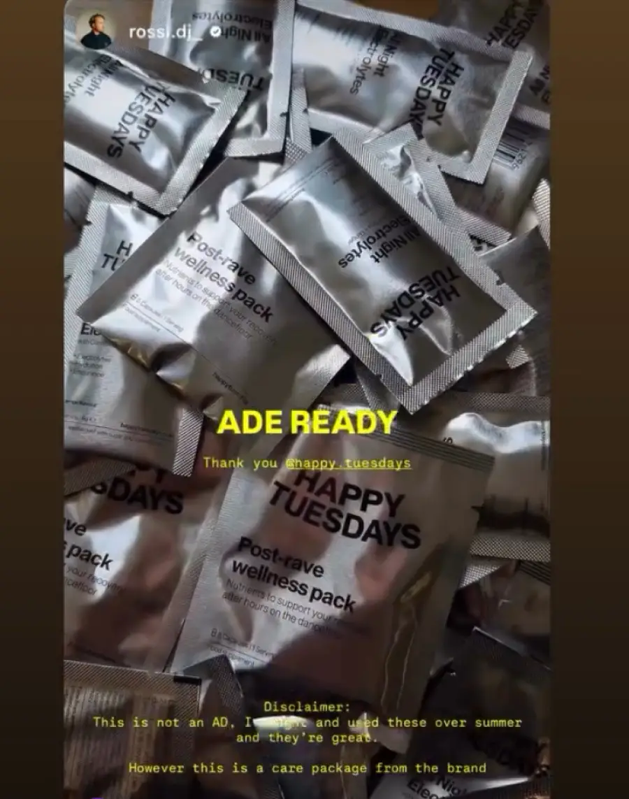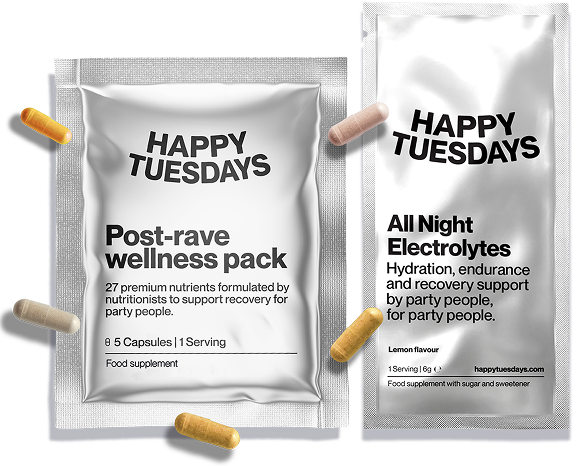 Post-Rave Wellness Packs and All Night Electrolytes to support recovery, hydration and productivity after late nights.